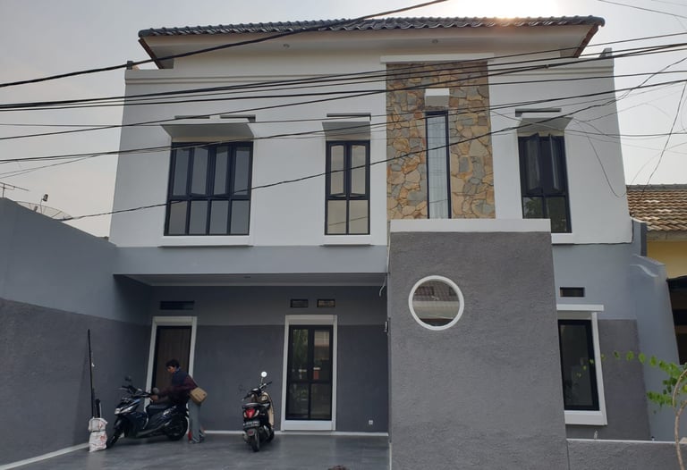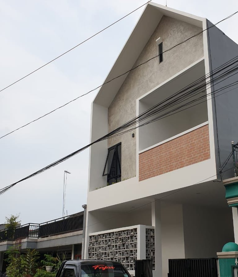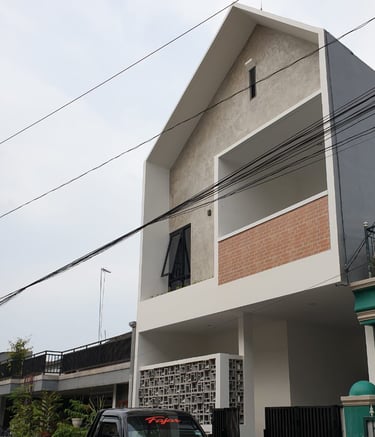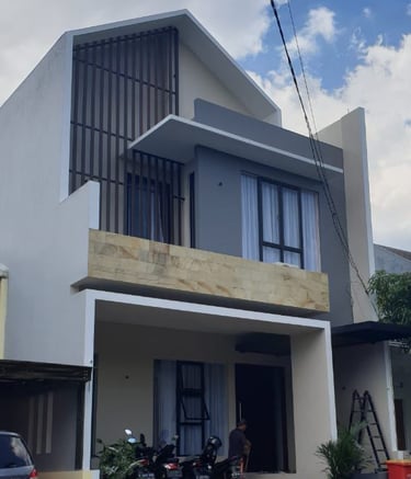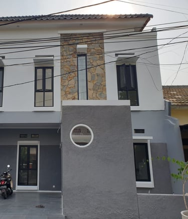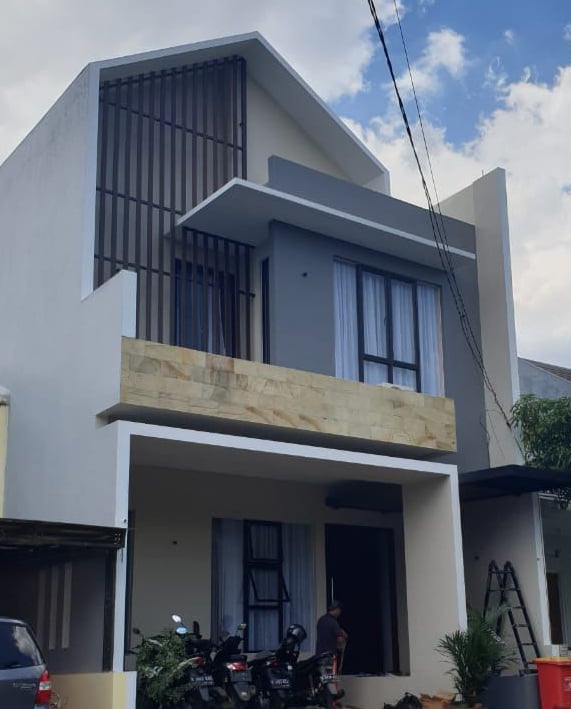Rumah dua lantai dengan desain modern minimalis yang memiliki fasad berwarna abu-abu dan putih, balkon dengan dinding batu, serta jendela besar. Ekspos sand-stone menambah cantik tampilannya.
