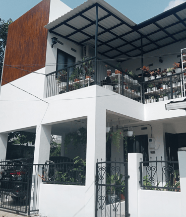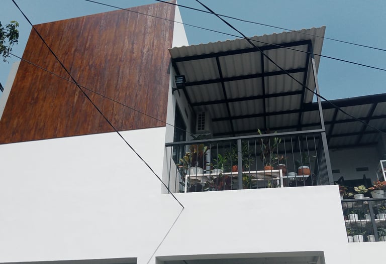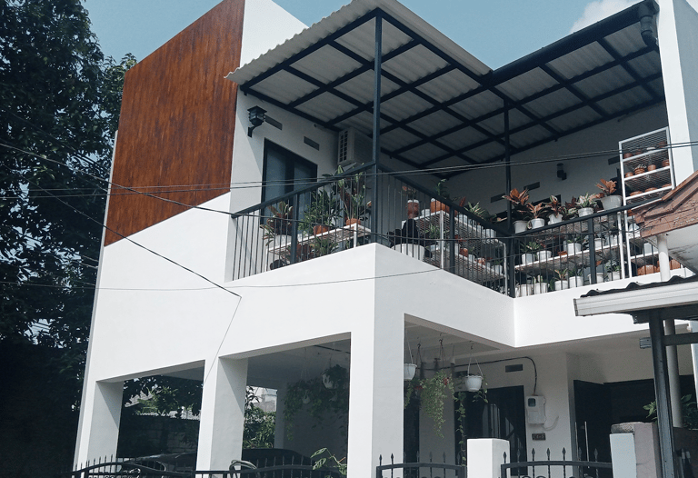 Didesain dengan banyak ruang untuk tanaman pot gantung, menciptakan suasana asri dan alami. Fasad kayu rumah melengkapi tema dengan sempurna, menambah nuansa pedesaan dan bersahaja.