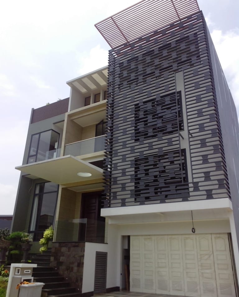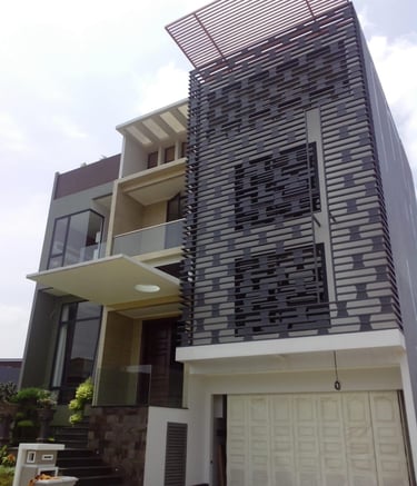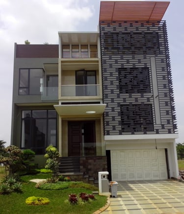 Rumah modern dengan desain arsitektur kontemporer yang memiliki fasad yang didominasi oleh dinding abu-abu dengan elemen dekoratif berbentuk balok horizontal dan vertikal di bagian depan. Rumah ini juga dilengkapi dengan garasi dan taman kecil.