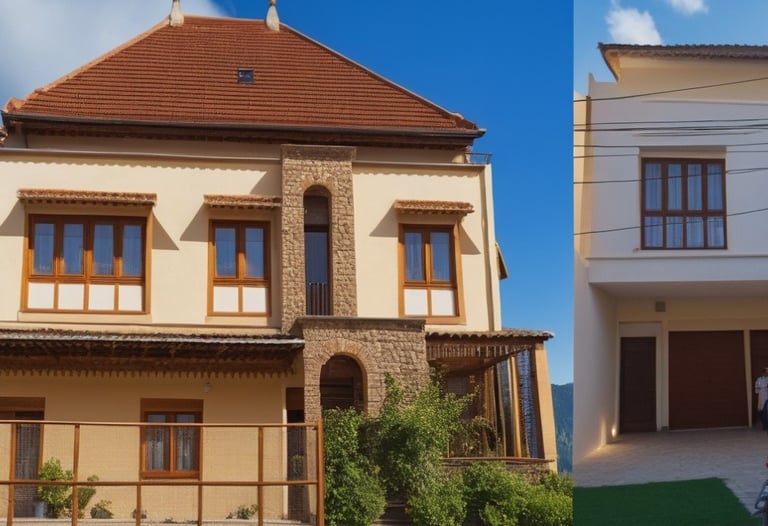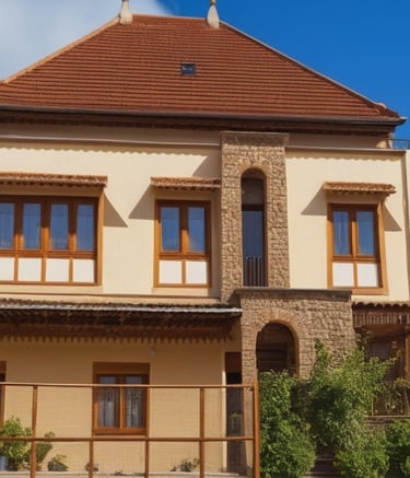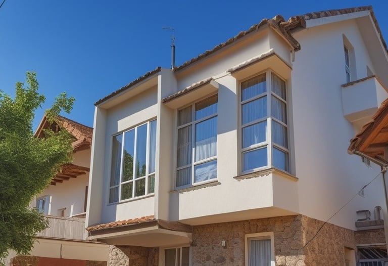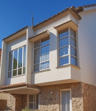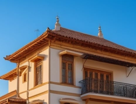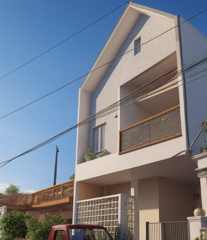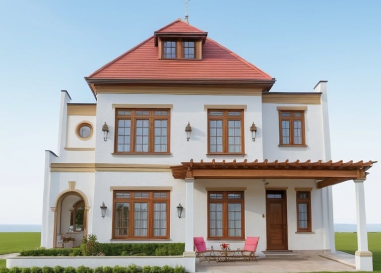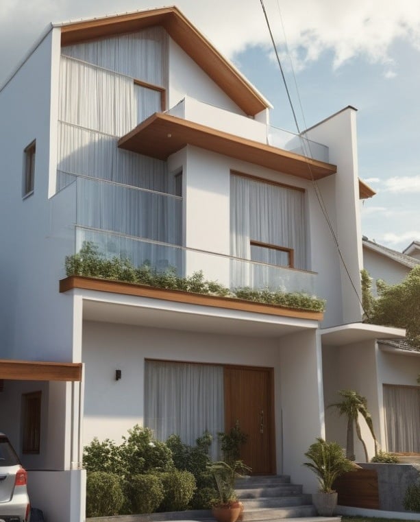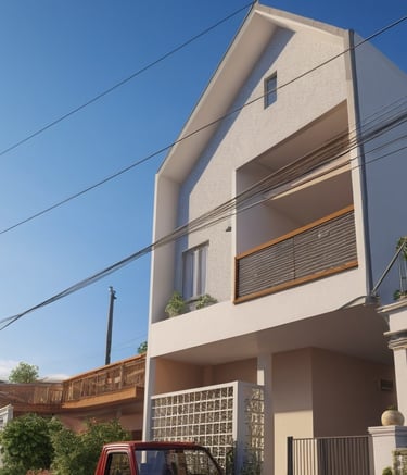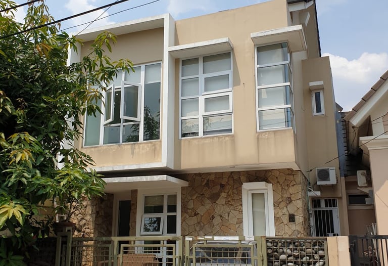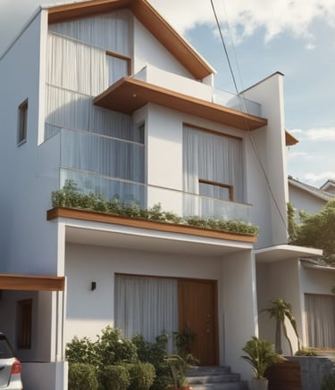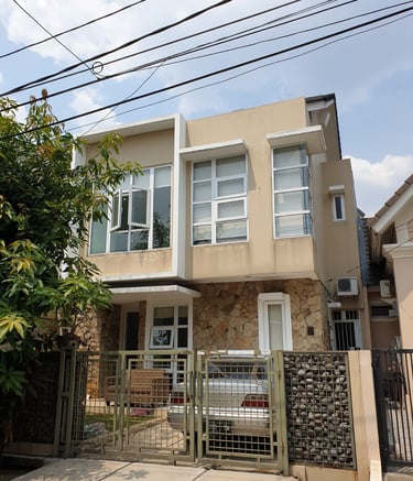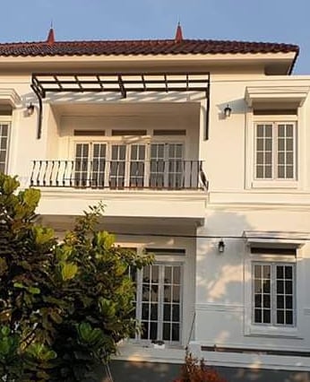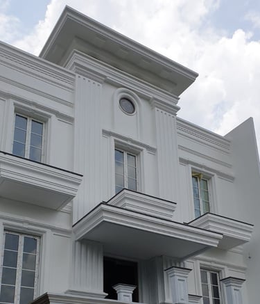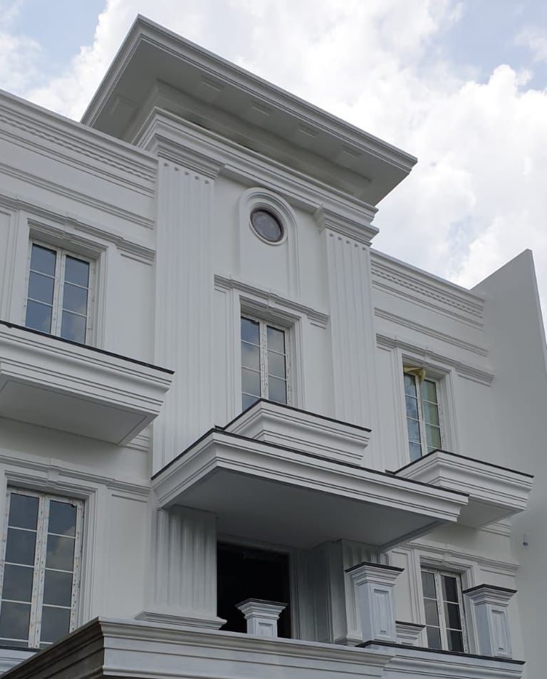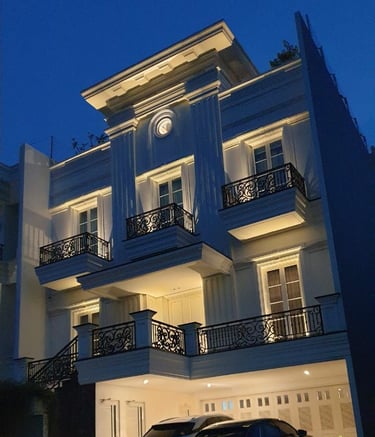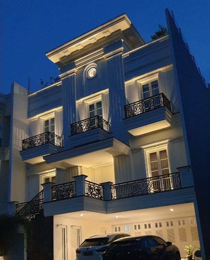 Rumah bergaya klasik yang terlengkapi oleh jendela-jendela besar serta balkon yang memperkuat kesan mewah. Fasad rumah didominasi oleh warna putih dengan detail ornamen yang elegan yang simetris dan berkesan kokoh.