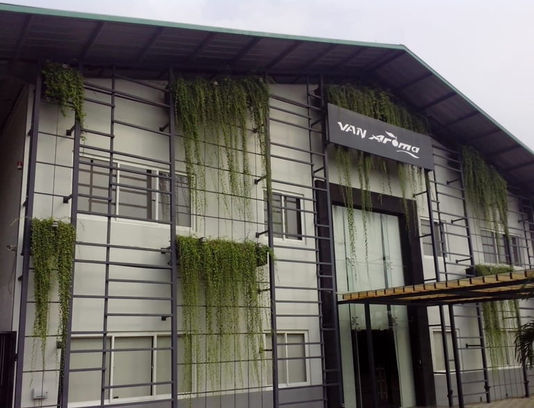 Bangunan industri ini memiliki desain green modern yang sederhana namun fungsional. Dindingnya dilapisi panel logam dengan rangka baja yang terlihat kokoh lengkap dengan tanaman rambatnya.